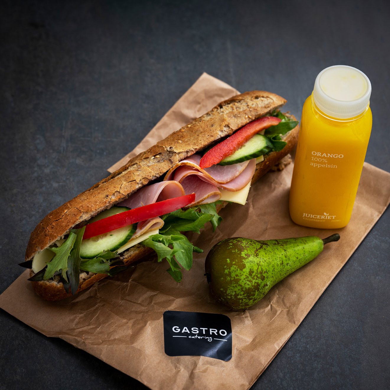 Assortert lunsjpose (30% vegetar) med baguette, hel frukt, juice