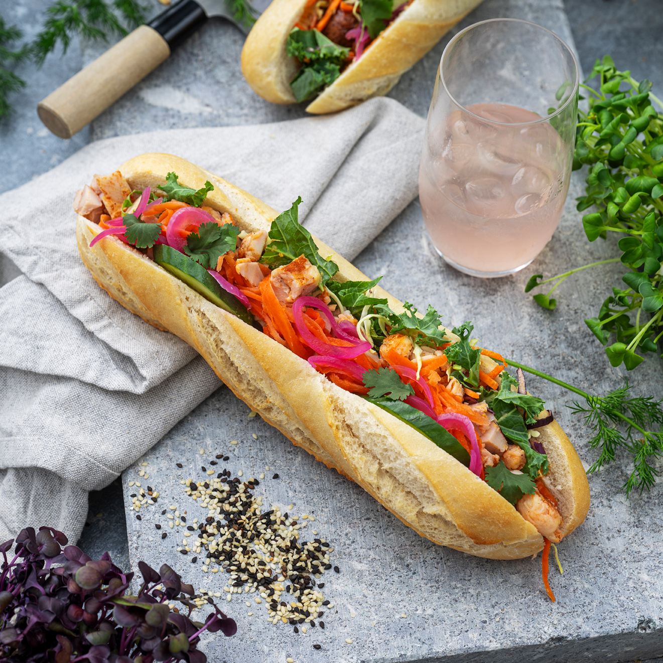 Baguette med kylling, syltet gulrot, kål, rødløk og chilimajones