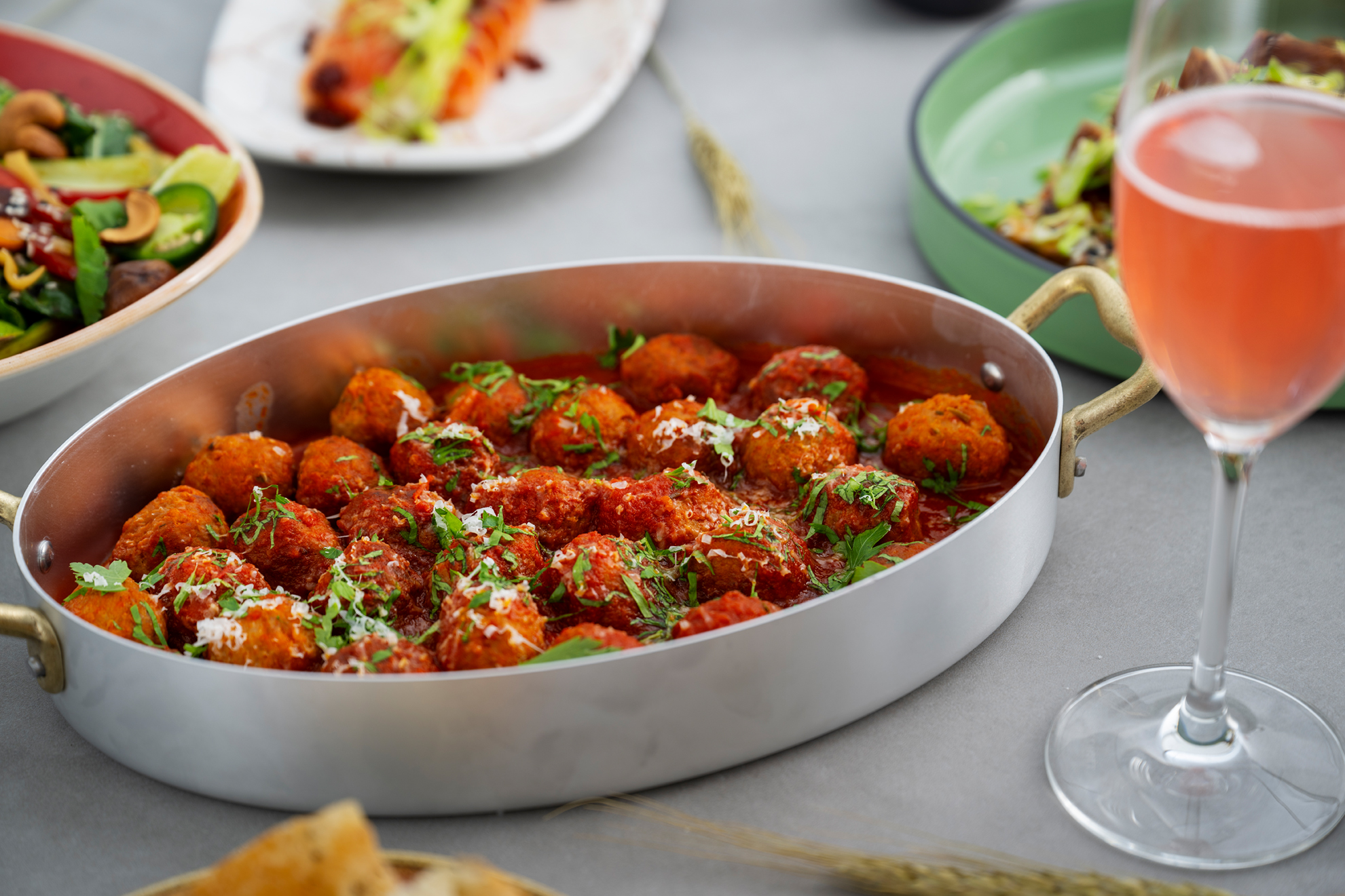 Pasta, kikerter, tomat, agurk, paprika, salat, syltet rødløk, rød pesto