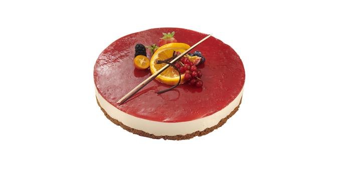 Deilig ostekake pyntet med friske frukter. 18-biter