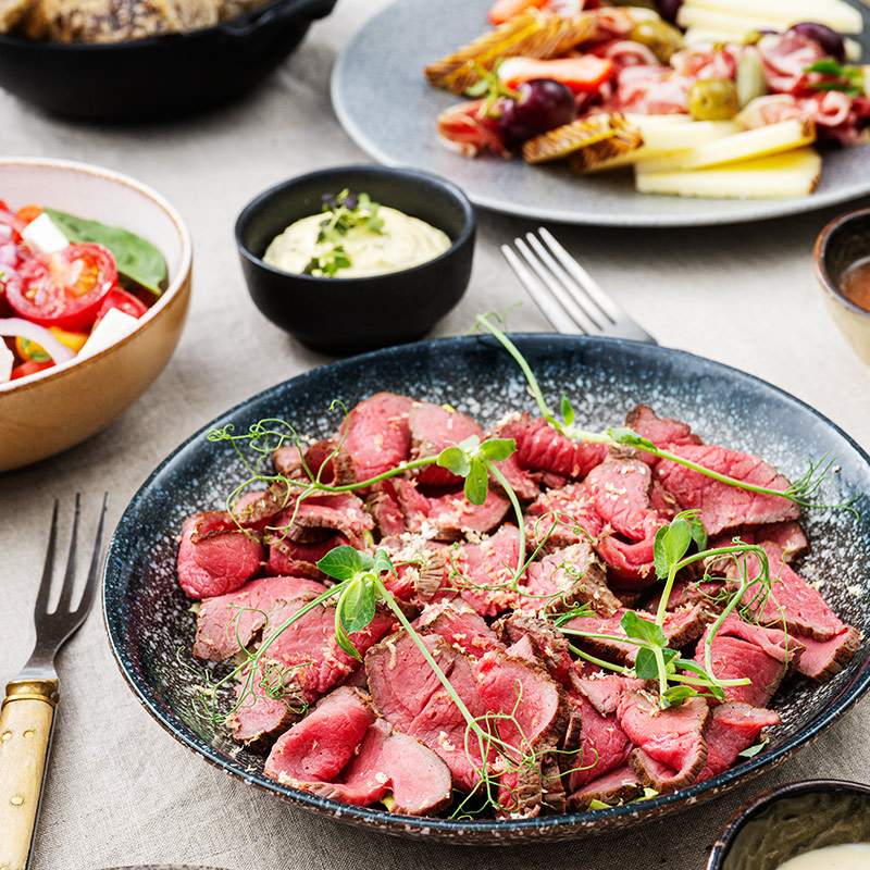 Mørbrad med kapers, rødløk, soltørket cherrytomat, parmesan og ruccolavinaigrette