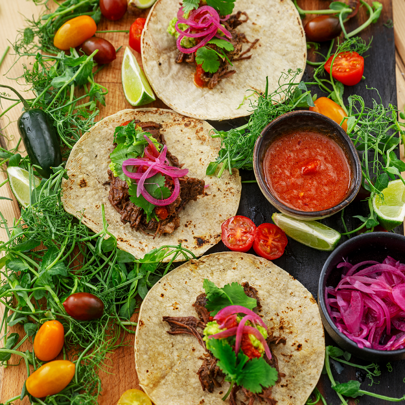 Syltet rødløk, tomatsalsa, koriander, guacamole, lime