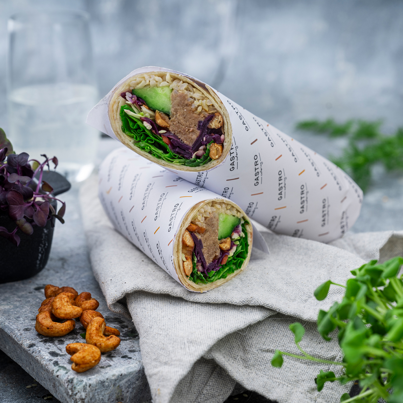 Wrap med Pulled Pork, Char Siu glaze, syltet kål, agurk, og brunt ris